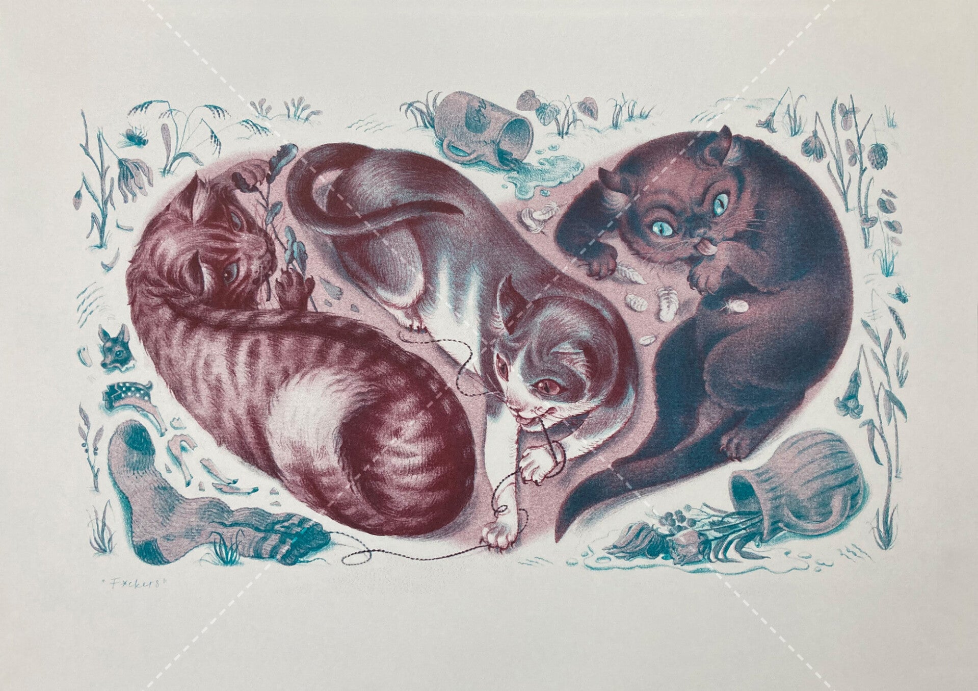 ‘F*CKERS’, for the never dying the love of cats. This two-toned risograph reproduction is printed in Light Teal and Burgundy ink on (off-white) Biotop paper.