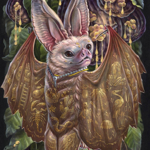‘GUSTO’; jackpot for a bat with an appetite (with wings adorned with images of the Mexican Loteria). The image has a light grey embellished border. The paper colour of this print is white.